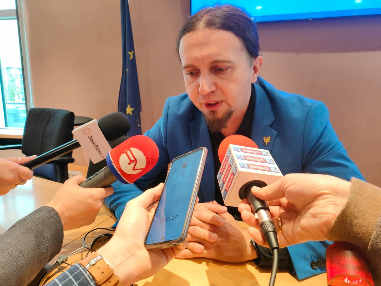 Poseł z kucykiem, w niebieskim garniturze