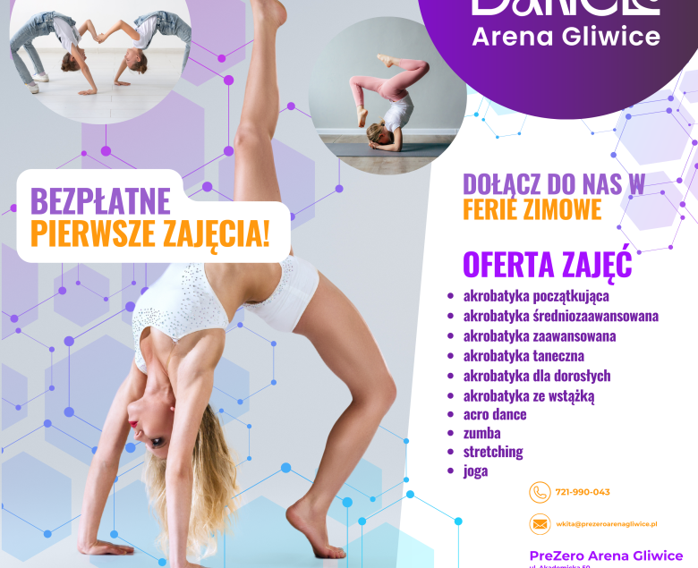 Dance Arena Gliwice, ul. Akademicka 31, w swojej ofercie ma różne zajęcia takie jak akrobatyka, zumba, joga, stretching i wiele innych. Akrobatyki prowadzona jest na trzech profesjonalnych ścieżkach typu Air Track, z wykorzystaniem materacy oraz specjalistycznego sprzętu treningowego. Zajęcia uczą nie tylko sprawności fizycznej, ale również dyscypliny, systematyczności, koncentracji oraz pracy w grupie.