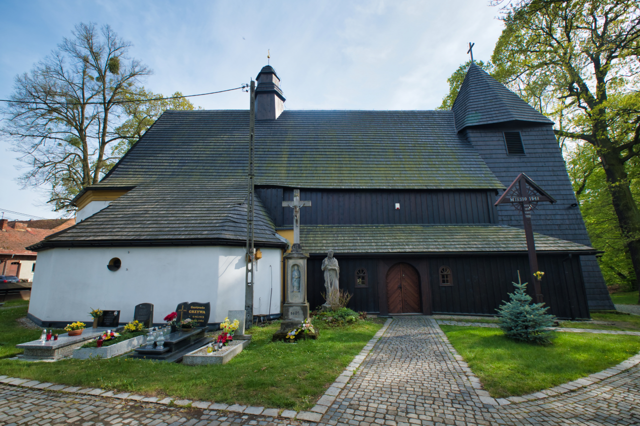 Najstarszą częścią świątyni jest murowane prezbiterium, które powstało na przełomie XV i XVI wieku. Drewniana nawa kościoła jest dużo młodsza, gdyż powstała w 1668 roku, a wieżę dobudowano 10 lat później. Na początku XVIII wieku wieża spłonęła w pożarze, ale pod koniec tego samego stulecia została odbudowana.