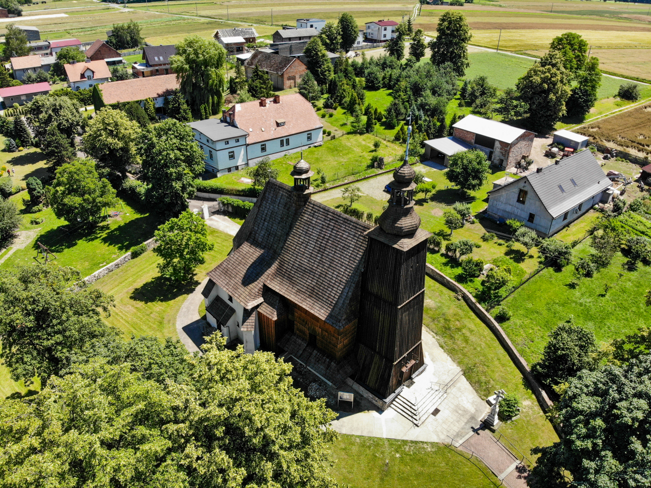 Podobnie jak kościół w Zacharzowicach, ten również odwiedziłem dwukrotnie i za pierwszym razem świątynia stała otwarta. Udało mi się wtedy zwiedzić środek, który jest ciekawy. Możliwość oglądania tak starych wnętrz jest niesamowita, szczególnie że w takich obiektach czuje się klimat dawnych czasów. Drewniana część kościoła posiada konstrukcję zrębową (wyjątkiem jest wieża, która ma konstrukcję słupową), a świątynia jest kryta gontem. W wieży znajduje się ponad 500-letni dzwon. Będąc w środku warto zwrócić uwagę na późnorenesansowy ołtarz z 1622 roku.