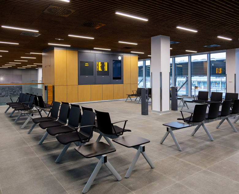 W założeniu Centrum Przesiadkowego nie zabrakło też inteligentnych, ekologicznych i sprzyjających oszczędnościom rozwiązań w duchu smart city. Na „falach” zadaszeń peronowych wykonano np. ultrawydajną, złożoną z prawie tysiąca paneli instalację fotowoltaiczną, która zasila m.in. ponad 700 energooszczędnych LEDów doświetlających poszczególne stanowiska autobusowe. W centralnej części kompleksu wykorzystano z kolei ekologiczną tech-nowinkę: okładziny z płyt elewacyjnych na bazie cementu fotokatalitycznego, który w dłuższym czasie zmniejsza w powietrzu stężenia szkodliwych substancji, wykazuje właściwości antybakteryjne i samoczyszczące.