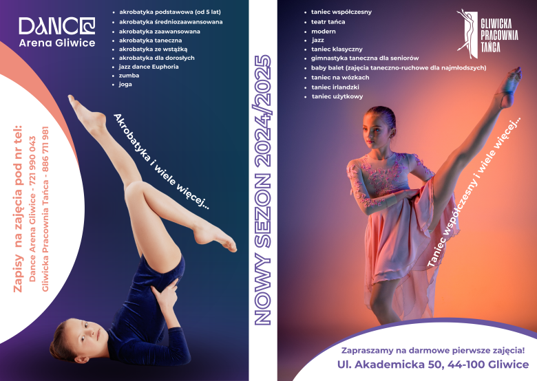 Stawiamy na rozwój, profesjonalizm i mnóstwo dobrej zabawy podczas trenowania! Niezależnie od tego czy dopiero zaczynacie swoją przygodę z tańcem lub akrobatyką, czy chcecie jeszcze bardziej rozwijać swoje umiejętności – te szkoły to strzał w dziesiątkę. Dance Arena Gliwice głównie specjalizuje się w akrobatyce dla dzieci, młodzieży i dorosłych, ale w ofercie znajdziecie jeszcze opcje taneczne na wysokim poziomie. Gliwicka Pracownia Tańca jest bezkonkurencyjna jeśli chodzi o taniec współczesny i taniec jazzowy dla każdej kategorii wiekowej. Na pierwszych zajęciach ćwiczycie za darmo. Dance Arena Gliwice honoruje karty Multisport, Medicover, FitProfit i PZU Zdrowie.