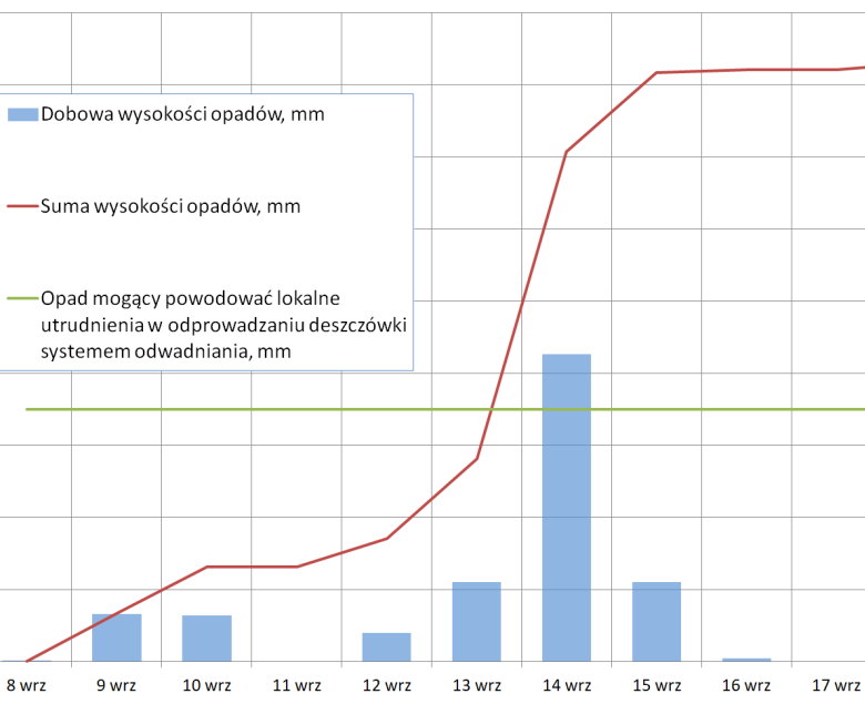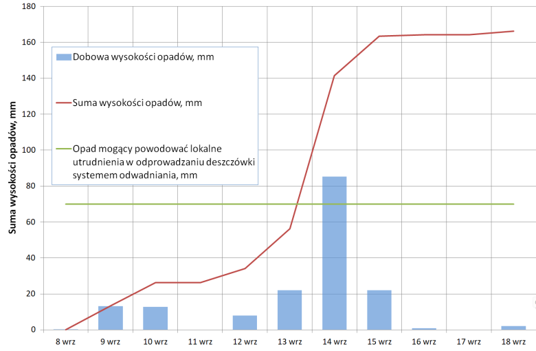 Należy podkreślić, że we wrześniu 2024 r wystąpił opad długotrwały który trwał 10 dni – od 8 do 17 września – spadło łącznie 167 mm deszczu, czyli niemal 25% całorocznej normy. W tym okresie wystąpił opad rekordowy odnotowany przez system monitoringu.