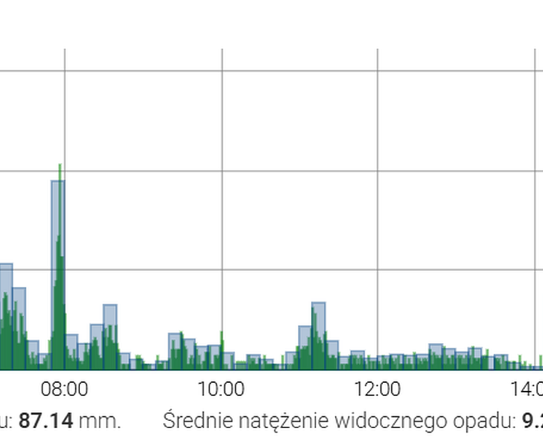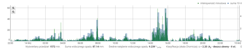 System monitoringu rejestruje nie tylko sumy, ale także intensywność opadów. 14 września 2024 roku system zarejestrował opad o chwilowej intensywności 40 mm/h – to tzw. deszcz ulewny, który sprawia, że nawet nowoczesna kanalizacja zaczyna pracować na granicy swoich możliwości.