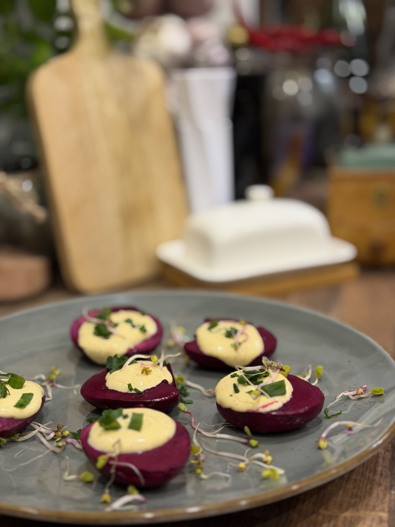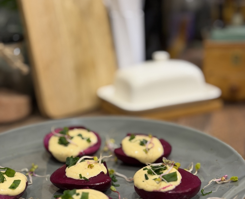 Zacznijmy od jajek faszerowanych i marynowanych w zakwasie z buraka. Do garnka dajemy jajka w temperaturze pokojowej, zalewamy zimną wodą i dodajemy sól. Od momentu wrzenia gotujemy około 8 minut. Następnie ostudźmy je zimną wodą. Obrane przekrawamy na pół, wyciągając żółtka do innego naczynia, a białka do kolejnego. Białka zalewamy zakwasem z buraka tak, by były całe przykryte. Następnie odstawiamy je do lodówki na 2-3 godziny. Do żółtek dodajemy majonez, musztardę sarepską, tarty chrzan oraz przyprawy. Wszystko blendujemy ze sobą do momentu połączenia się składników. Przekrojone białka odcedzamy z zakwasu i wypełniamy masą. Dekorujemy je dodatkowo szczypiorkiem oraz kiełkami rzodkiewki.