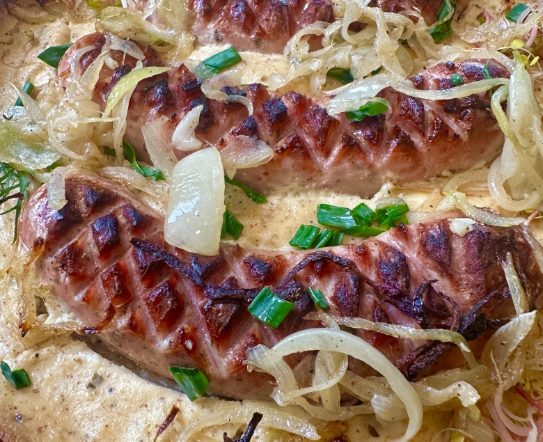 Kolejny przepis będzie przypomnieniem z ubiegłego roku. Białe kiełbaski zapiekane z sosem chrzanowo- musztardowym. To danie z naczynia żaroodpornego, które z pewnością zachwyci wszystkich na wielkanocnym stole. Do rondelka dodajmy śmietanę, majonez, chrzan, musztardę oraz sól, pieprz i majeranek. Mieszamy i podgrzewamy wszystko do połączenia składników i złączenia smaków. Tak powstanie nam kremowy sos, niezbędny do wyłożenia naczynia, w którym te białe kiełbaski będą prażyć się w piekarniku. Na patelni z odrobiną oleju musimy podsmażyć nacięte kiełbaski do zrumienienia się. Następnie przełożymy je talerz w celu odpoczynku. Na tę samą patelnię dorzućmy cebulę oraz czosnek zbierając smak. Kontynuujmy smażenie do szklistości. Czas na złożenie naszej wielkanocnej wariacji. Na dół naczynia żaroodpornego wykładamy sos, następnie podpieczone białe kiełbaski, które okraszamy cebulą z czosnkiem. Nasze danie wkładamy na 35 minut do nagrzanego piekarnika 180 stopni w opcji termoobieg. Podajemy je w tym naczyniu na desce do krojenia posypując całość posiekanym koperkiem.