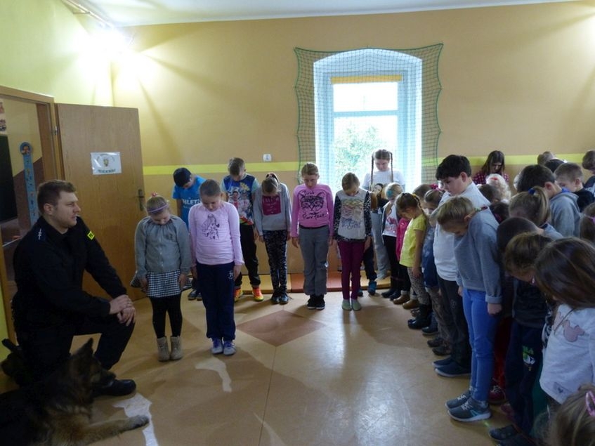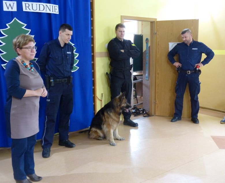 Umiejętność tę opanowała znakomicie, co udowodniła podczas spotkania z dziećmi. Najpierw jednak jej opiekun opowiedział uczniom z Rudna, jak należy zachować się w kontakcie z obcym psem oraz co robić, kiedy pies zachowuje się agresywnie i atakuje. Dzieci poznały postawę obronną „drzewo” i „żółwik”. Dzięki pogadance z policjantem wiedzą, czego pies nie lubi a co sprawia mu przyjemność. Największą atrakcją była oczywiści możliwość pogłaskania Kory.