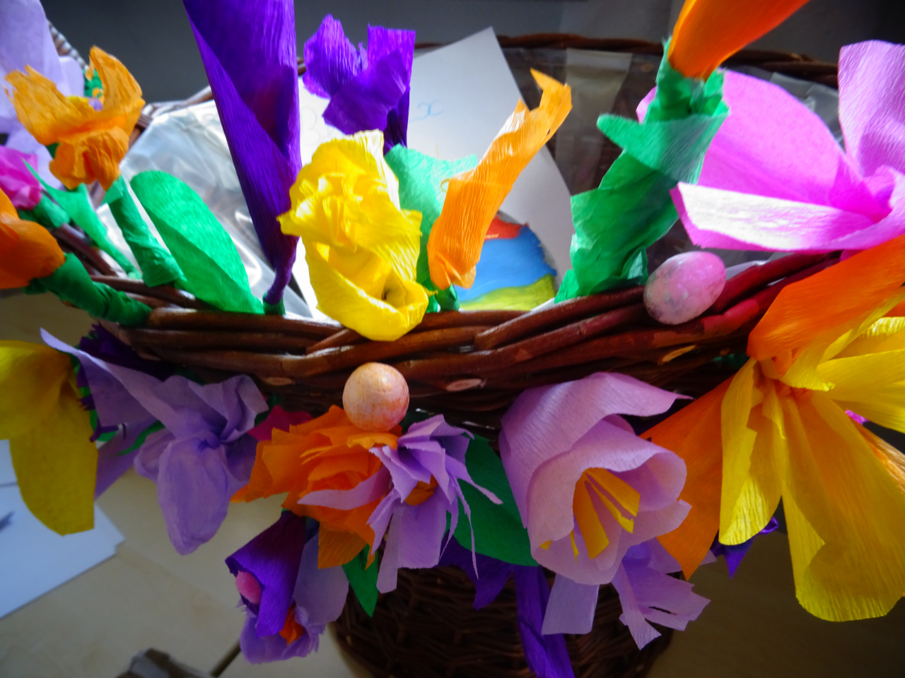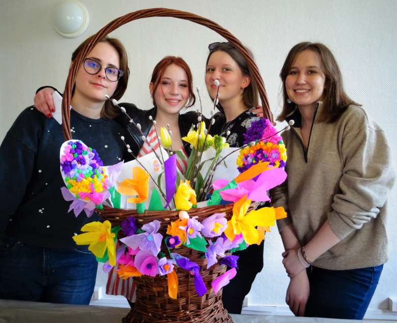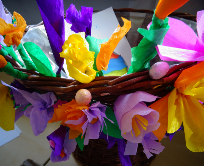 Wielka moc na Wielkanoc - warsztaty plastyczne przygotowane przez wolontariuszki gliwickiego V Liceum Ogólnokształcącego dla gości z Ukrainy okazały się doskonałym pomysłem. W budynku przy przy Zygmunta Starego 19 w Gliwicach powstał wielki kosz wypełniony kwiatami, życzeniami, rysunkami, wyklejankami i pisankami.
