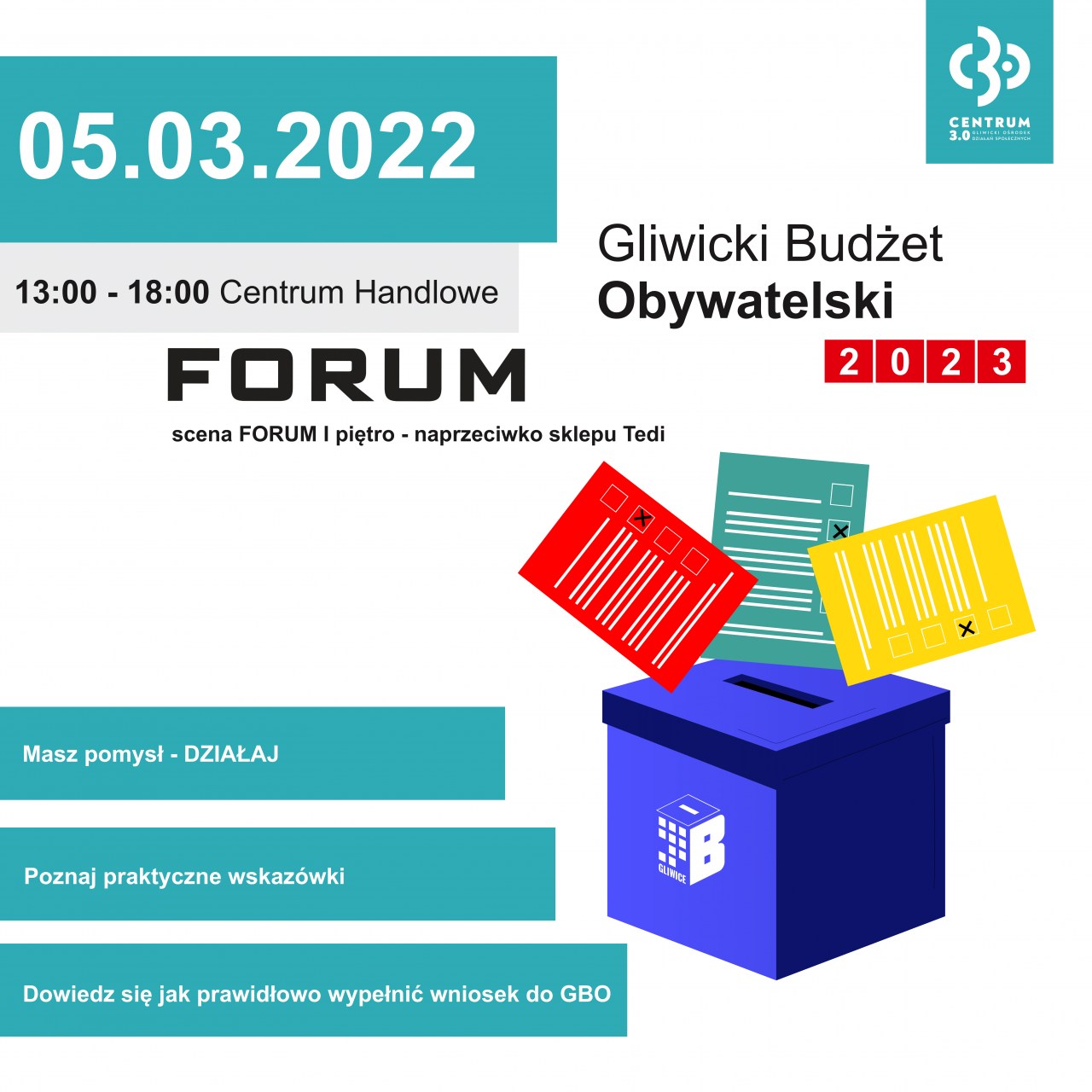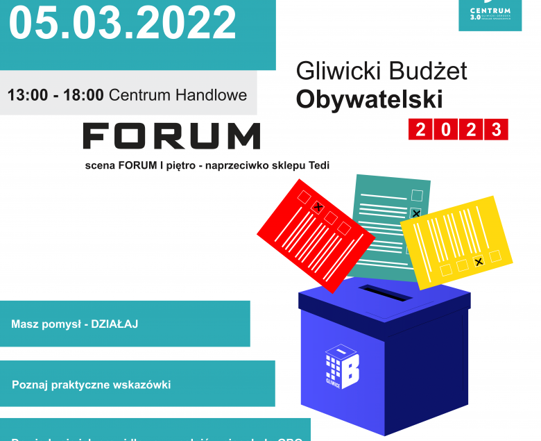 Dlatego w sobotę 5 marca w CH FORUM Gliwice odbędzie się Maraton Pisania Wniosków, składanych do Gliwickiego Budżetu Obywatelskiego (GBO). Od godziny 13.00 do 18.00 na I piętrze w Scenie
