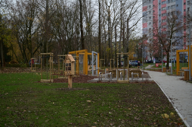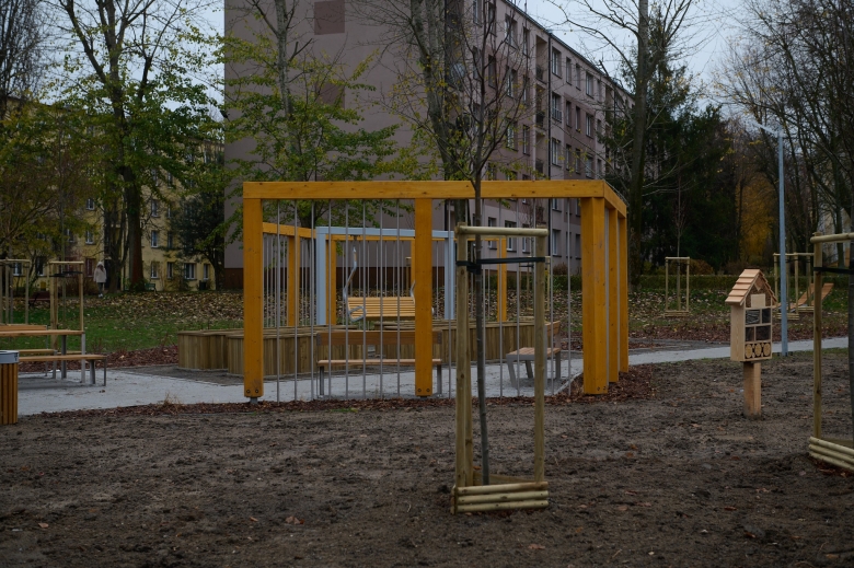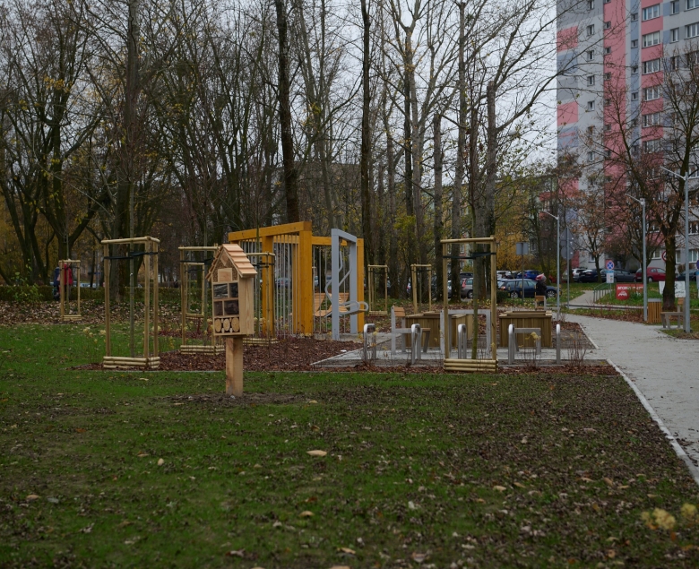 Nowy skwer został obsadzony gatunkami, które dobrze znoszą warunki miejskie i zwiększają bioróżnorodność tej części osiedla. Znalazły się tu lipy szerokolistne, jarząby pospolite i ozdobne wiśnie Kiku-shidare, a także krzewy: dereń biały, lilak Meyera, hortensja bukietowa oraz wiciokrzew Heckrotta. Kompozycję uzupełniają byliny – rozplenice, jeżówki, szałwie i rudbekie – oraz aromatyczne zioła, które przyciągają owady zapylające. Wysiana łąka kwietna będzie zakwitać od wiosny, tworząc naturalne zaplecze pokarmowe dla pszczół i trzmieli. Dodatkowo ustawiono specjalne domki dla owadów, które wzmacniają funkcję parku jako mikrohabitatów dla miejskiej fauny.
