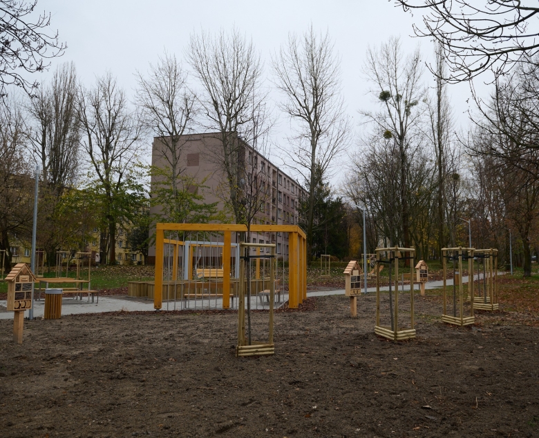 Ekologiczny charakter miejsca podkreślają także rozwiązania techniczne. Alejki mają nawierzchnię przepuszczającą wodę, dzięki czemu deszcz swobodnie wsiąka w grunt, a nie spływa do kanalizacji. To istotny element w retencji wód opadowych, szczególnie ważny na osiedlach z przewagą powierzchni utwardzonych. Oświetlenie zapewniają lampy solarne, które działają dzięki energii słonecznej i nie generują kosztów zużycia prądu.