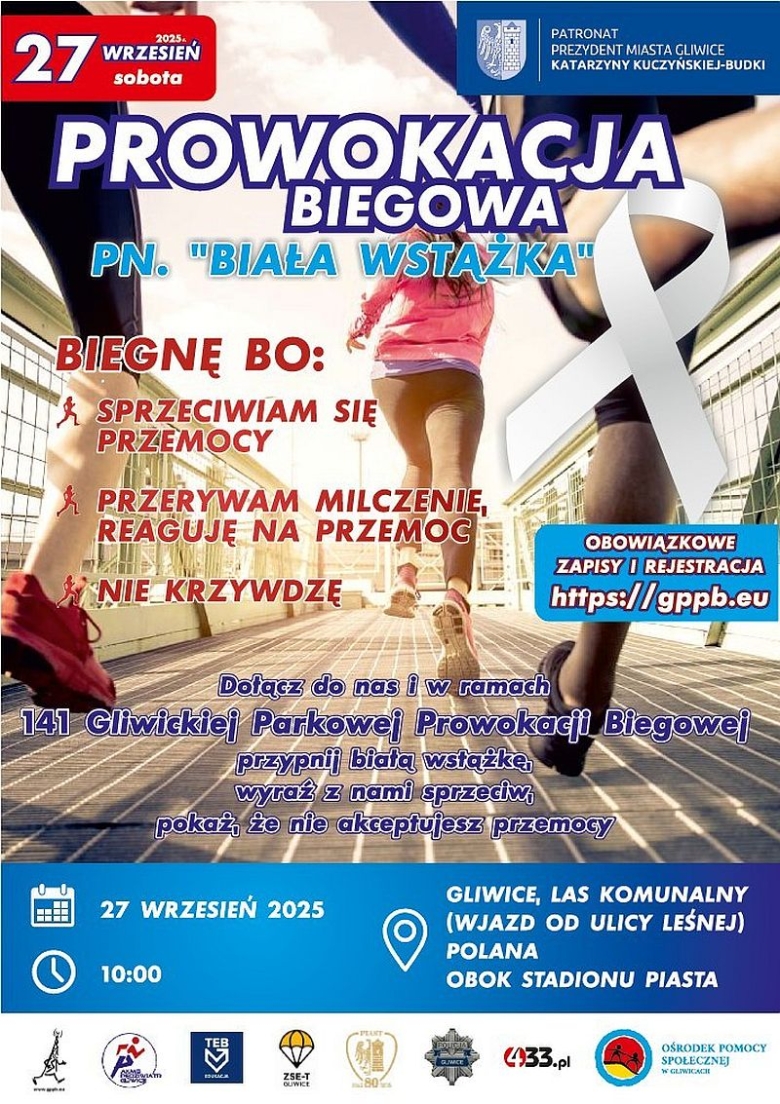 Już w najbliższą sobotę, 27 września, Gliwice ponownie pobiegną przeciw przemocy. Na polanie za stadionem Piasta (wjazd od ul. Leśnej) odbędzie się 141. edycja Gliwickiej Parkowej Prowokacji Biegowej, która w tym roku – podobnie jak poprzednio – odbywa się pod hasłem „Bieg Białej Wstążki”. Biuro zawodów zostanie otwarte o godz. 9.00, a wspólny start zaplanowano na godz. 10.00.