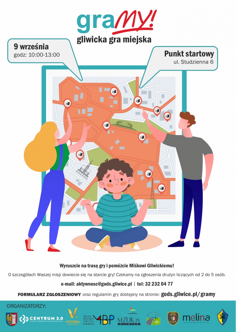 Wyobraźcie sobie licealistę, 15-letniego Miśka, który ma przed sobą trudne zadanie – przygotować ważną prezentację i przedstawić ją swojej klasie. Jest zestresowany, nieco bezradny – bez Was sobie nie poradzi. Chcecie mu pomóc? To dołączcie do gry miejskiej „graMY”, ruszcie w teren i rozwiążcie zadania. Nie tylko pomożecie bohaterowi zabawy, ale także sami będziecie mogli otrzymać nagrodę.