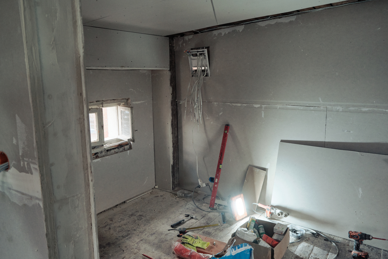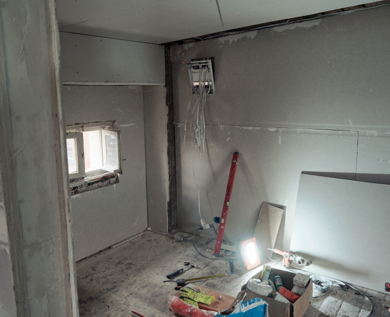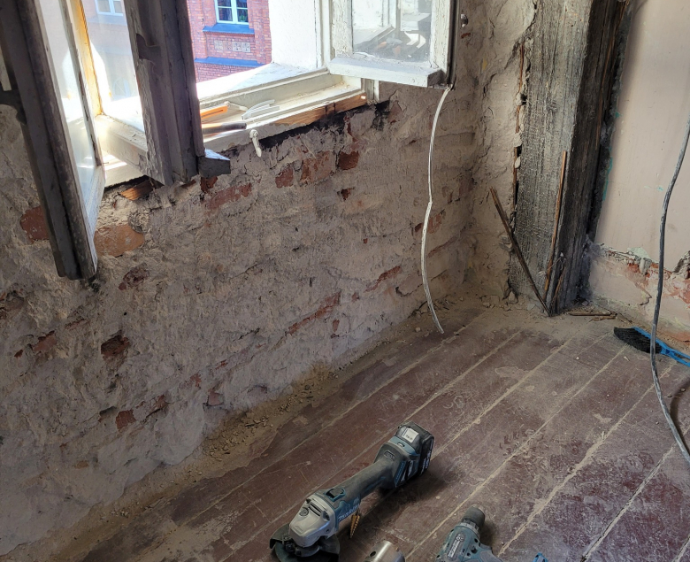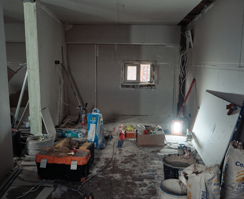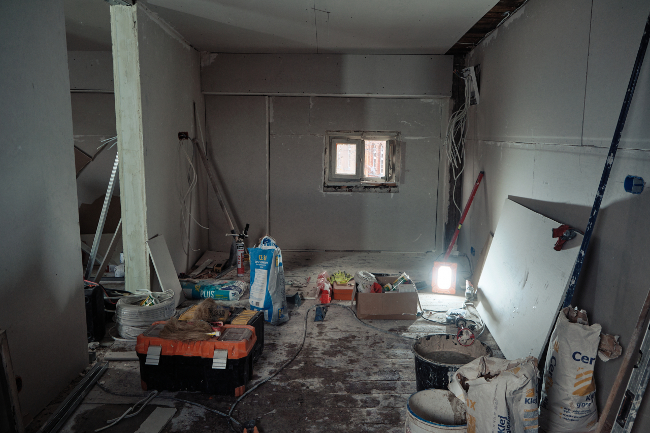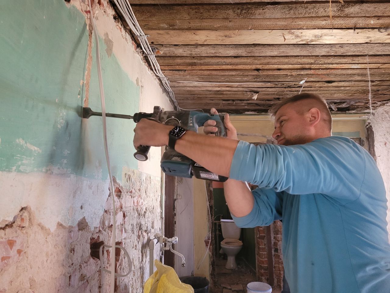 Kurz unoszący się nad gruzem i wzlatujący z powierzchni wierconych ścian wgryza się w oczy. Antycovidowa maseczka przydaje się może i bardziej, niż podczas pandemii.