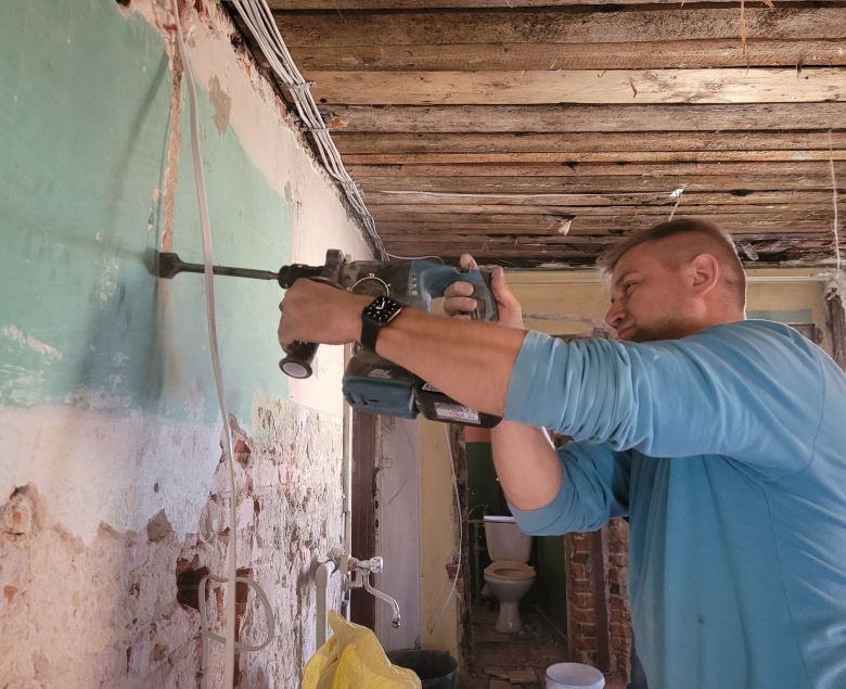 Uśmiechnięty Tomek, budowlaniec młotem pneumatycznym wkuwa się w ścianę. Trwa remont mieszkania, które posłuży młodej samotnej matce z dwójką małych dzieci. Za tym szczytnym dziełem stoi organizacja o nazwie Habitat for Humanity.