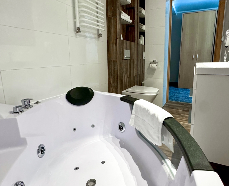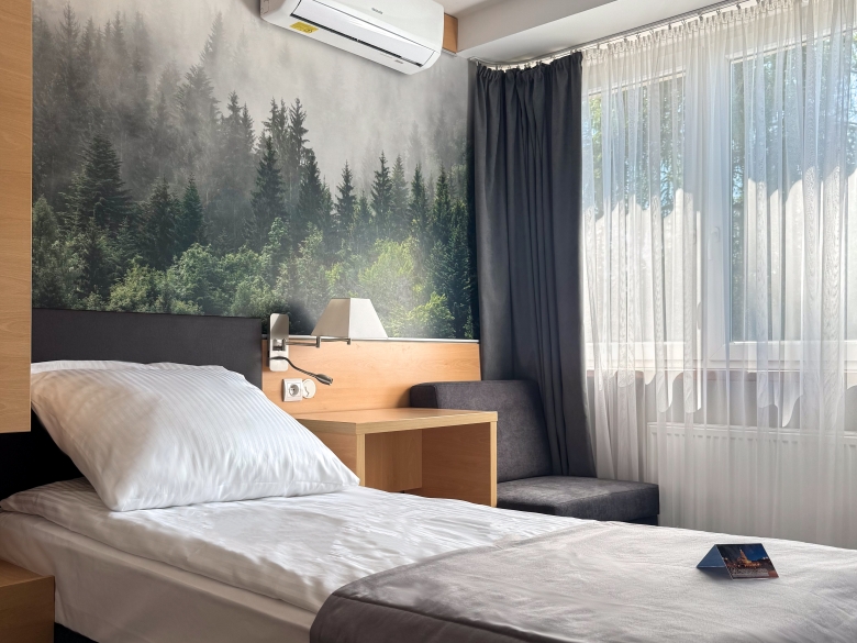 Kiedyś Leśny oferował 38 pokoi, po modernizacji do dyspozycji oddanych zostało 60, od jedno- i dwuosobowych po większe metraże oraz apartamenty. W standardzie są m.in. klimatyzacja, szybkie Wi-Fi, telewizor LCD i prywatna łazienka. W ofercie znajdziemy także pokoje rodzinne, przestronne „LUX” z wanną z hydromasażem oraz pokój „medical” zaprojektowany z myślą o gościach z ograniczoną mobilnością. Dla części pokoi przewidziano słoneczną ekspozycję z widokiem na kąpielisko. To zestaw rozwiązań, który sprawdza się zarówno przy krótkich wyjazdach służbowych, jak i dłuższych pobytach z dziećmi.