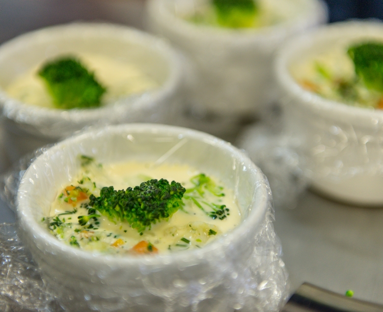 – Moja grupa ma do wykonania terrinę warzywną – mówił Adam, mieszkaniec Rudzińca, uczeń klasy trzeciej technikum, który wspierał Karolinę i Martynę z gimnazjum na osiedlu Sikornik. – To danie gotowane na kąpieli wodnej. W jego skład wchodzą brokuły, kalafior i marchewki. Wszystko zalewamy sosem ze śmietany i jajek z kaszą manną oraz bakaliami. Na koniec udekorujemy jeszcze koktajlowymi pomidorkami, koperkiem i płatkami migdałów.