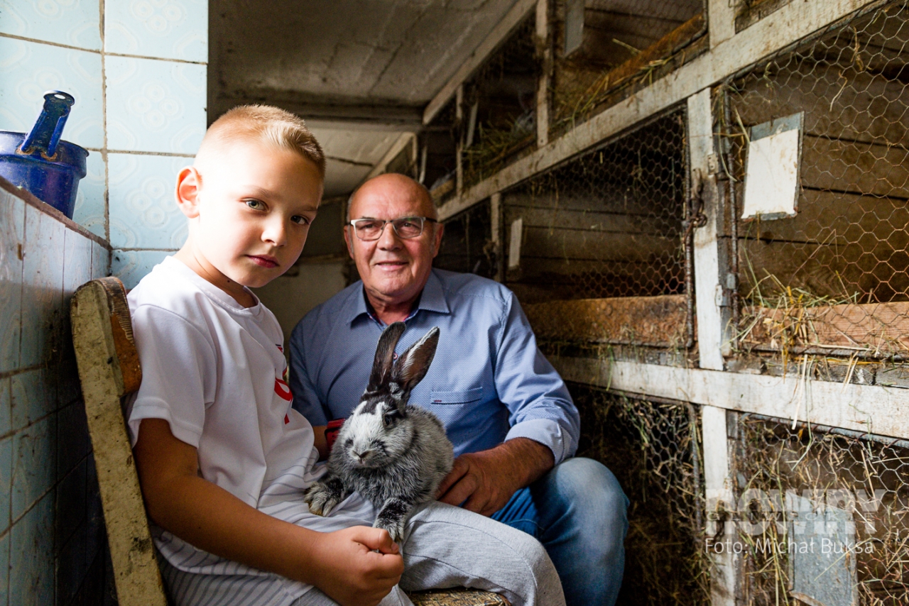 Piontek oprowadza nas po swoim obejściu. Dumnie pokazuje skrzydlaty i kicający inwentarz: gołębie (rysie polskie, kingi, lahore), małe kury (chabo, czubatki), mandarynki (kaczki) i króliki wielkie jasnosrebrzyste.