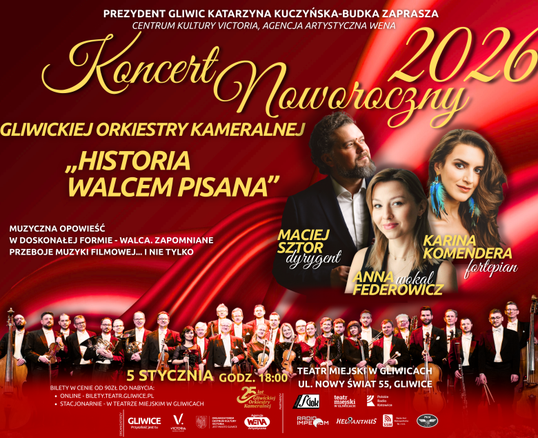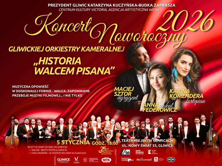 Gliwicka Orkiestra Kameralna zaprasza na Koncert Noworoczny, który odbędzie się 5 stycznia 2026 roku o godz. 18.00 w Teatrze Miejskim w Gliwicach. Wydarzenie będzie finałem obchodów jubileuszu 25-lecia orkiestry.