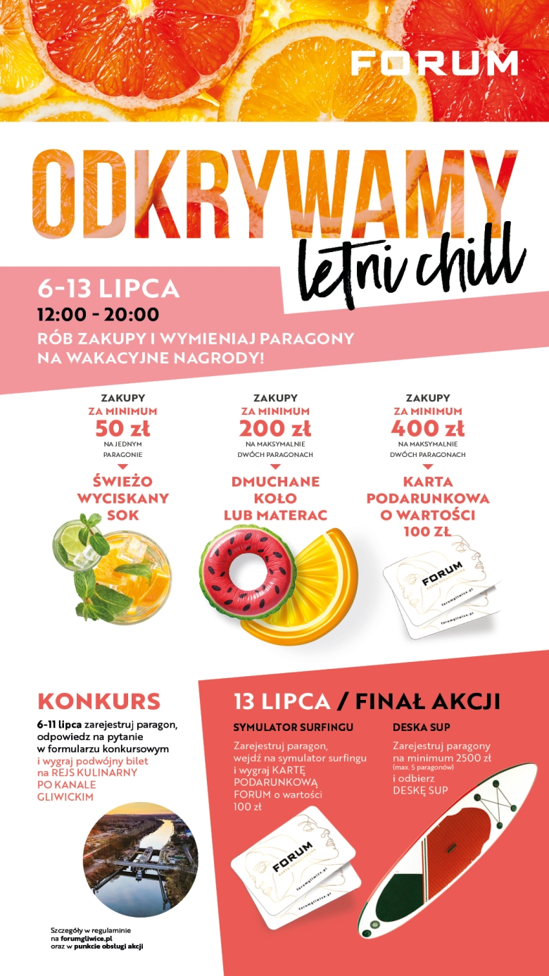 13 lipca odbędzie się finał – dzień pełen adrenaliny! Będzie można poczuć morską bryzę i okiełznać fale na symulatorze surfingu. Co godzinę najlepszy wynik zostanie nagrodzony kartą podarunkową o wartości 100 zł do CH FORUM. Także tego dnia do odbioru dzięki paragonom będzie aż 10 desek SUP!