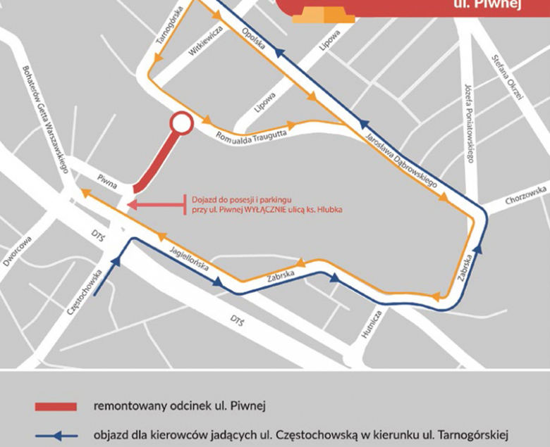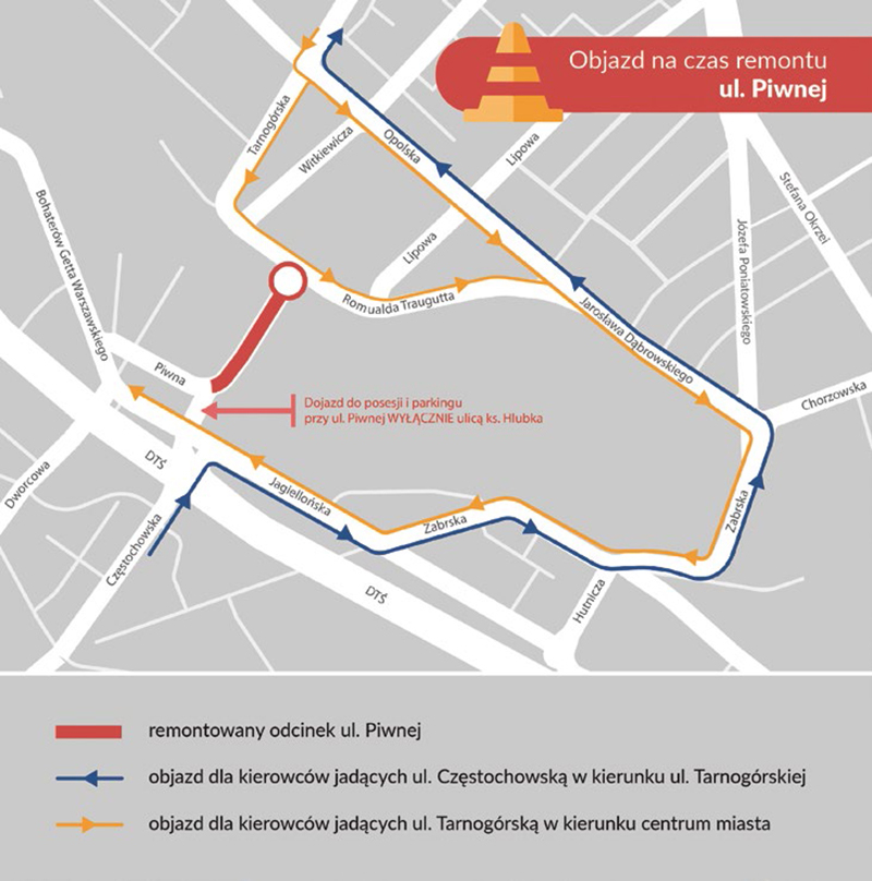 Na czas robót zamknięty dla ruchu samochodów pozostanie odcinek ul. Piwnej – od skrzyżowania z ul. ks. Hlubka do skrzyżowania z ulicami Traugutta i Tarnogórską (wiadukt kolejowy).
