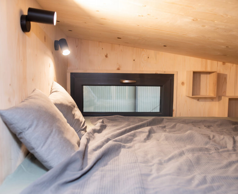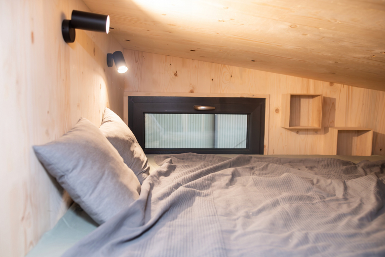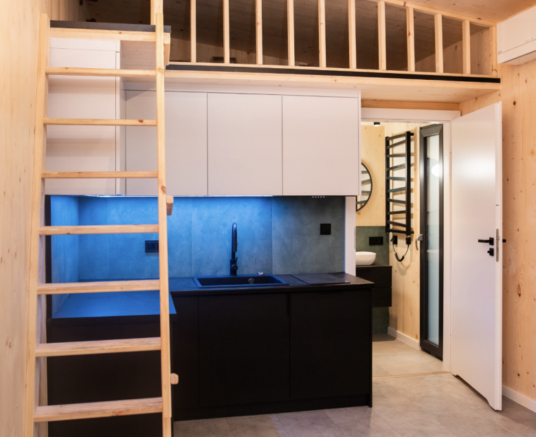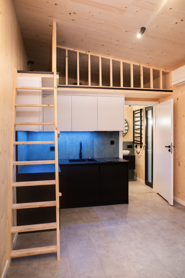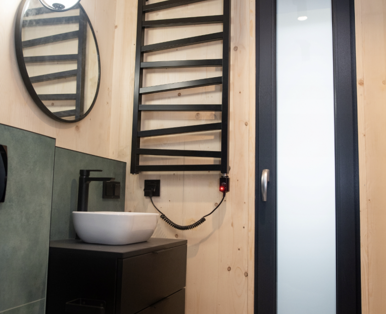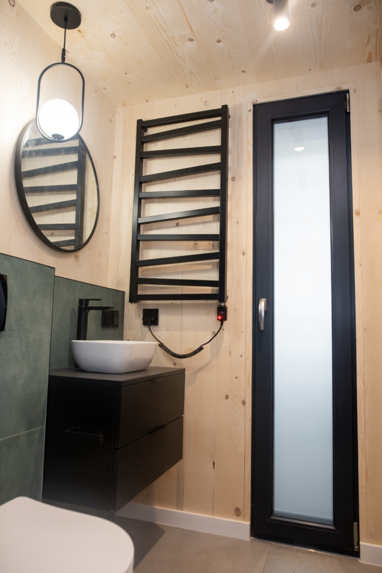 Elewacja, zaizolowana wełną skalną, wykończona jest deską drewnianą świerkową i płytami Rockpanel. Natomiast wykończenie wewnątrz obejmuje panele podłogowe, w pełni wykończoną łazienkę i kuchnię ze sprzętami AGD (lodówką, płytą grzewczą, zmywarką i okapem), szafy zabudowane, oświetlenie wewnętrzne i zewnętrzne, gniazdka, włączniki, meble ruchome.
