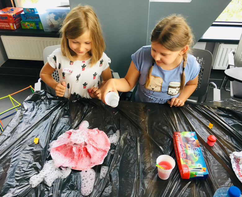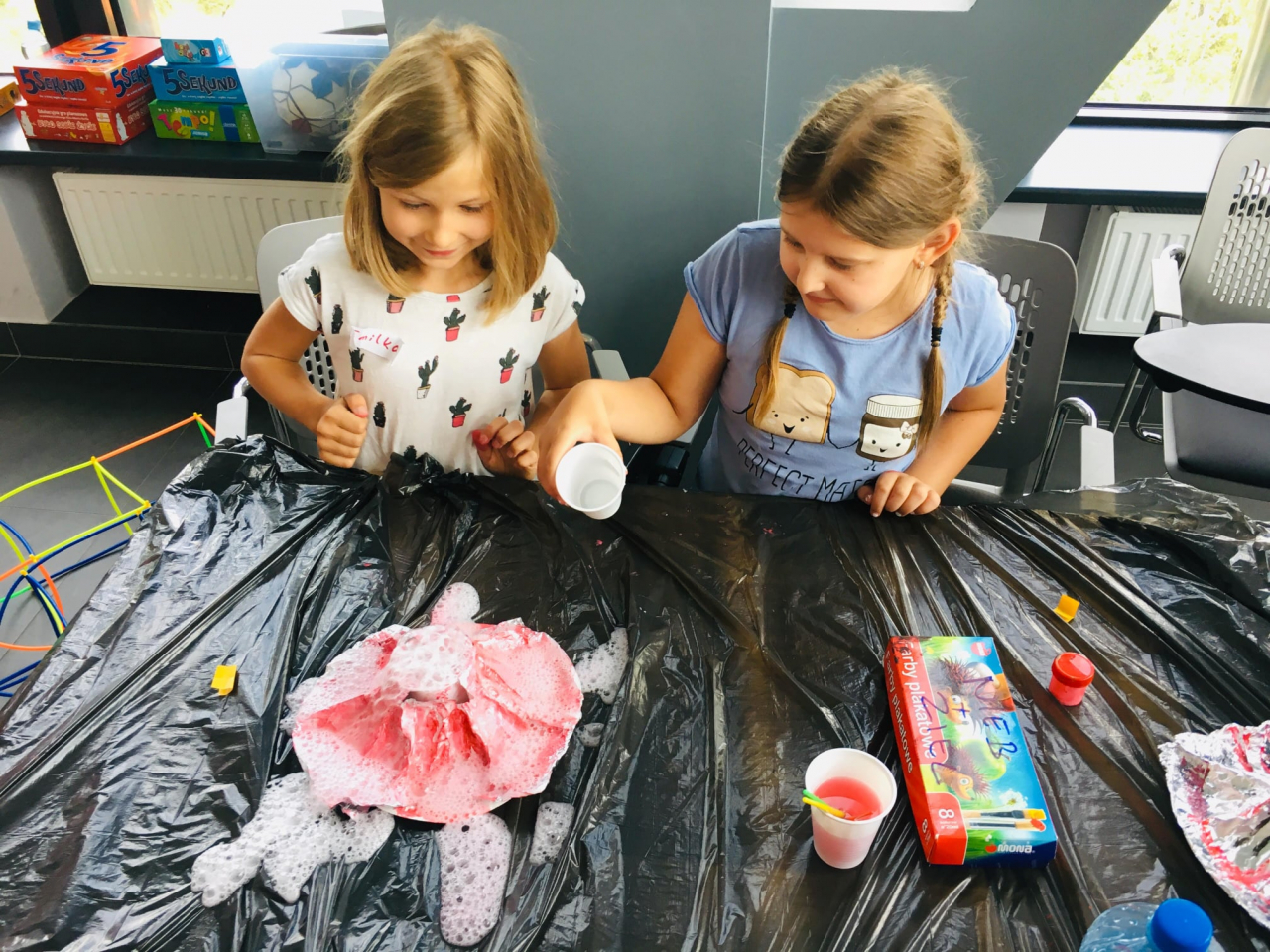 - - budowa własnych wulkanów, burzy w słoiku i masy sensorycznej,