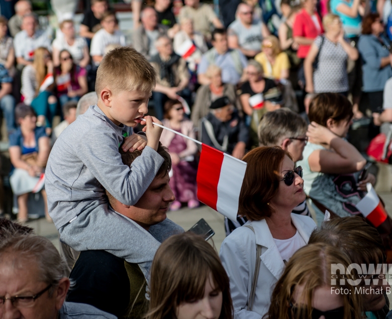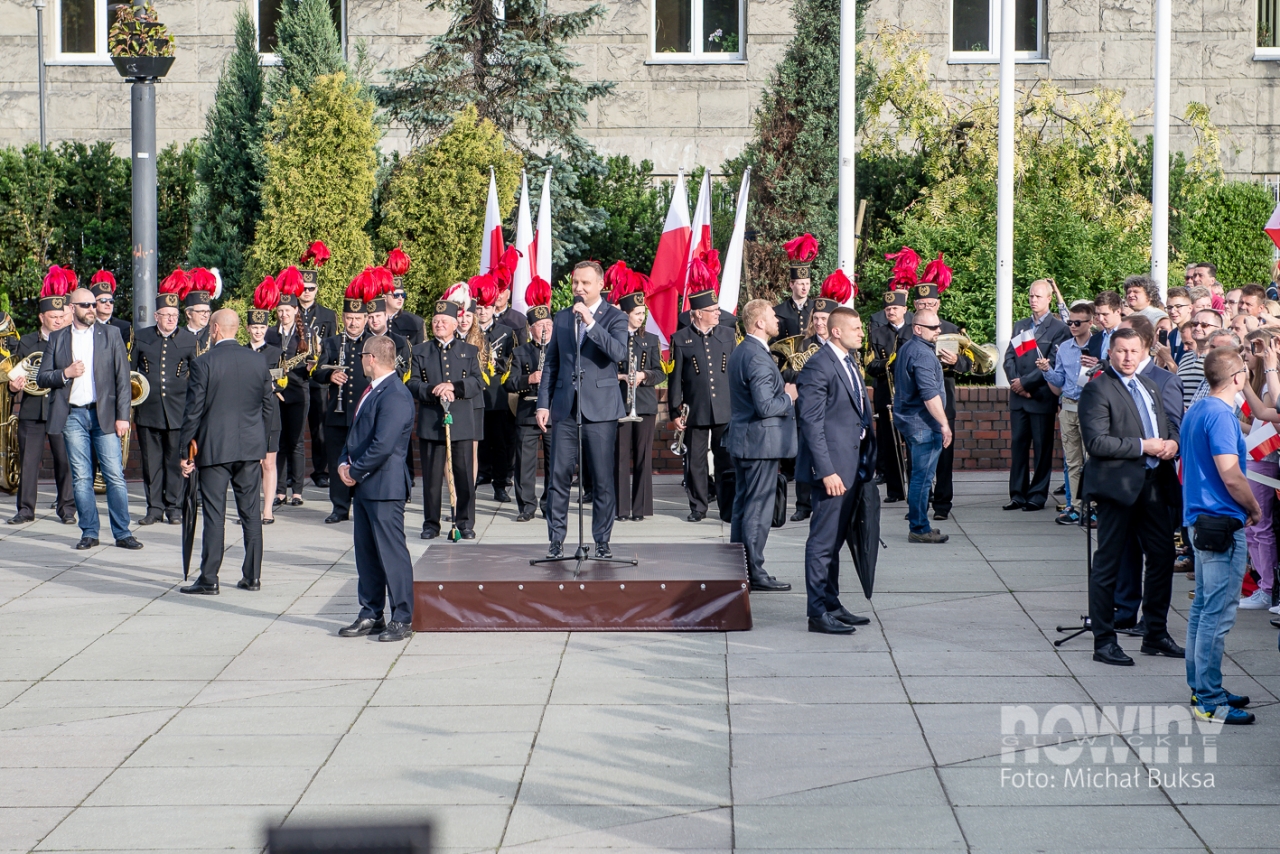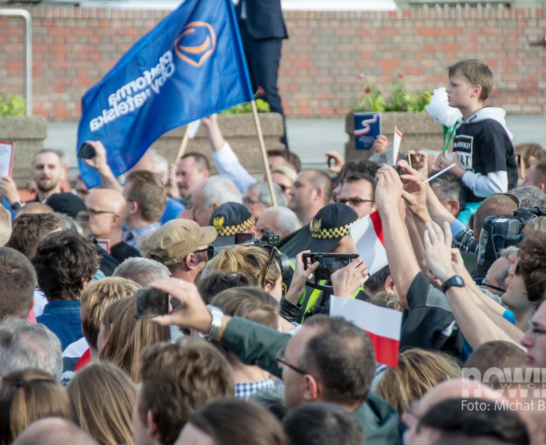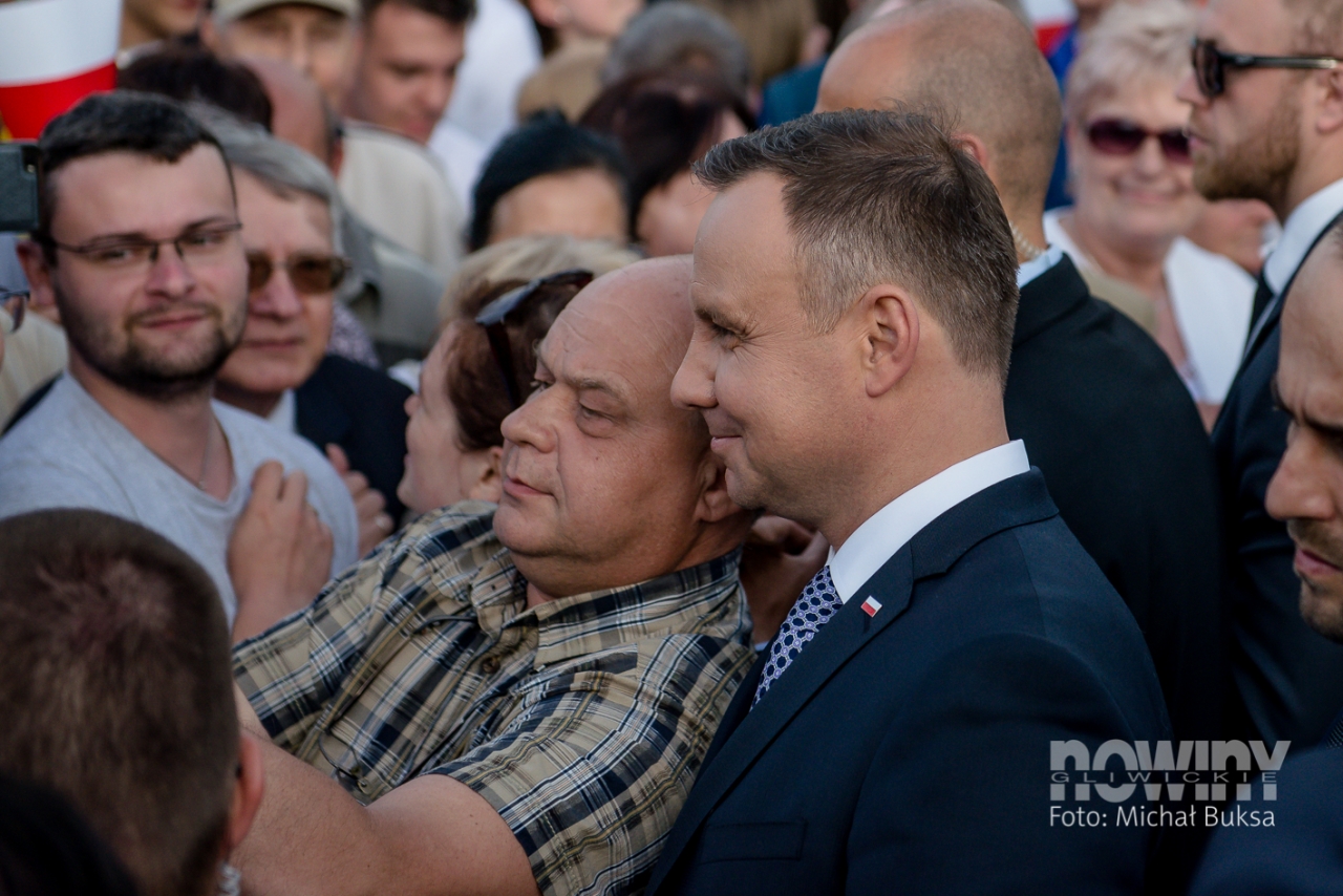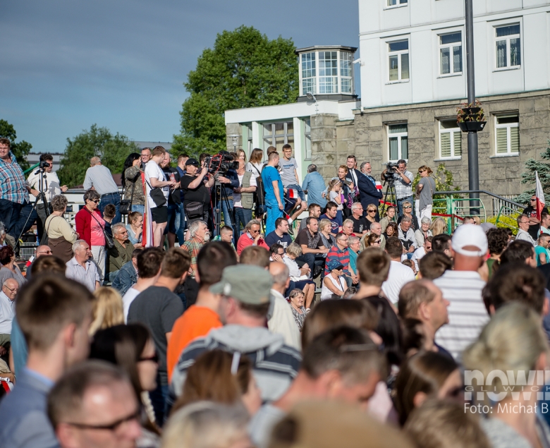 Mieszkańcy gromadzili się placu Krakowskim od godz. 17.00: przed bramkami ustawiały się kolejki, a kto chciał, mógł dostać papierową biało-czerwoną chorągiewkę. Podest dla prezydenta Dudy ustawiono w centralnej części placu, tam też stanęła się orkiestra dęta kopalni Sośnica. W tłumie znalazły się transparenty Gazety Polskiej, KOD - u i Platformy Obywatelskiej.