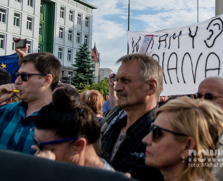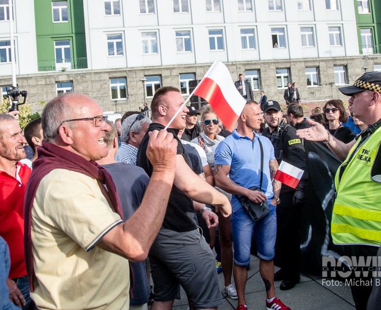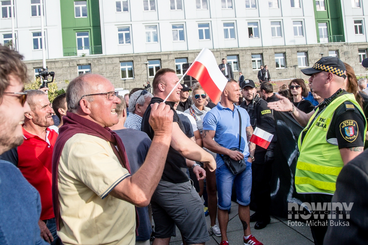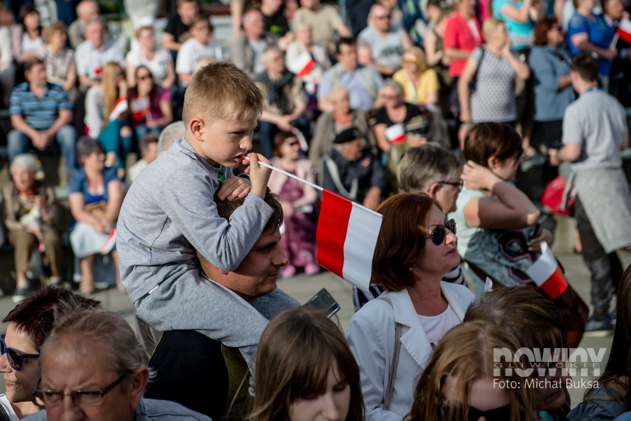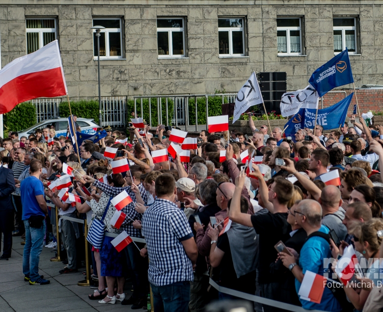 Mieszkańcy gromadzili się placu Krakowskim od godz. 17.00: przed bramkami ustawiały się kolejki, a kto chciał, mógł dostać papierową biało-czerwoną chorągiewkę. Podest dla prezydenta Dudy ustawiono w centralnej części placu, tam też stanęła się orkiestra dęta kopalni Sośnica. W tłumie znalazły się transparenty Gazety Polskiej, KOD - u i Platformy Obywatelskiej.