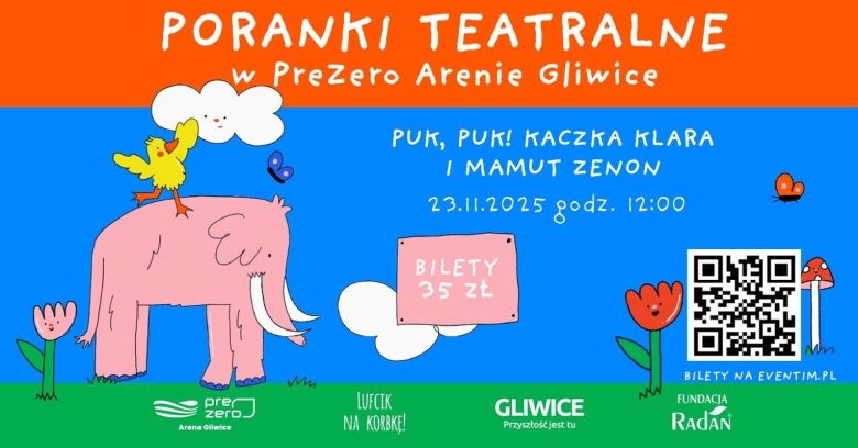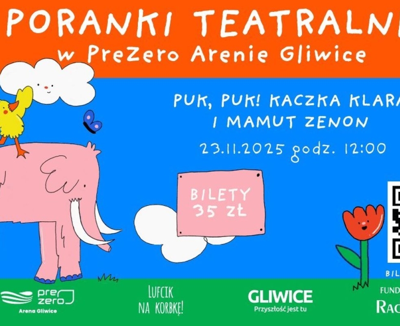 W niedzielę, 23 listopada o godz. 12:00 w PreZero Arenie Gliwice (ul. Akademicka 50, wejście C) po raz pierwszy w Gliwicach będziemy mieli szansę zobaczyć pocieszną Kaczkę, która śni tylko o tym, by polecieć na chmurę oraz ostrożnego Mamuta, który boi się zmian i woli wszystko dobrze przemyśleć, zanim podejmie decyzję. Co wyniknie ze spotkania tej dwójki tak różnych bohaterów? Na pewno wiele zabawnych sytuacji, niespodziewanych zwrotów akcji i mnóstwo radości dla najmłodszych widzów!