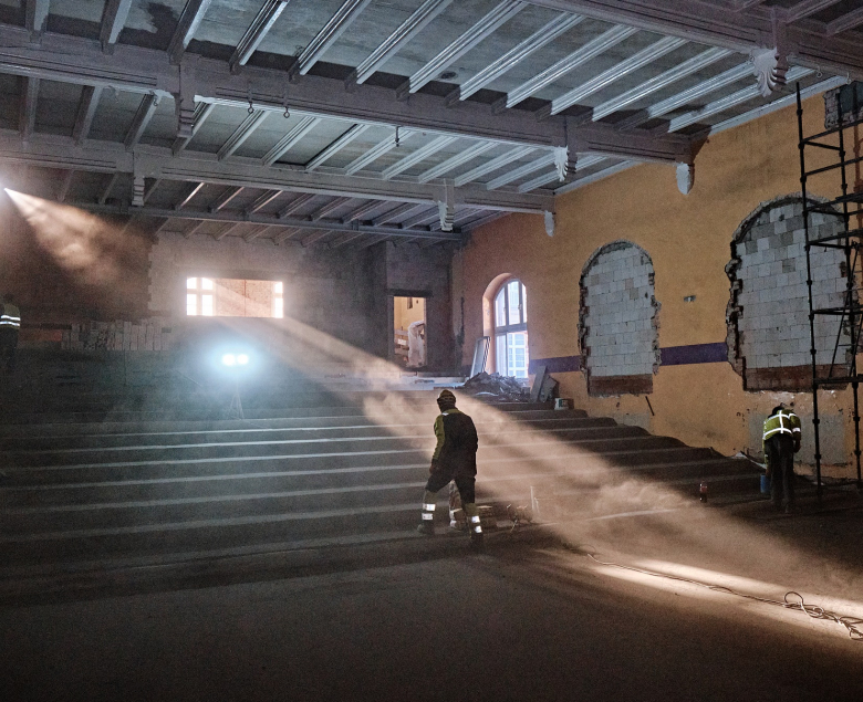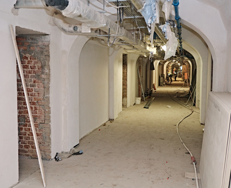 Stare tynki na korytarzach i klatkach schodowych są obecnie skuwane, a w salach dydaktycznych kładzione są już nowe. Trwa tam typowa „wykończeniówka”, łącząca tynkowanie z montażem ścian i tzw. przedścianek wraz z zabudową m.in. płyt akustycznych oraz malowaniem. Wykonywane są również warstwy podposadzkowe pod przyszłe parkiety. Równolegle w całym budynku prowadzone są prace instalacyjne związane z centralnym ogrzewaniem, sieciami wodno-kanalizacyjną, elektryczną i wentylacyjną.