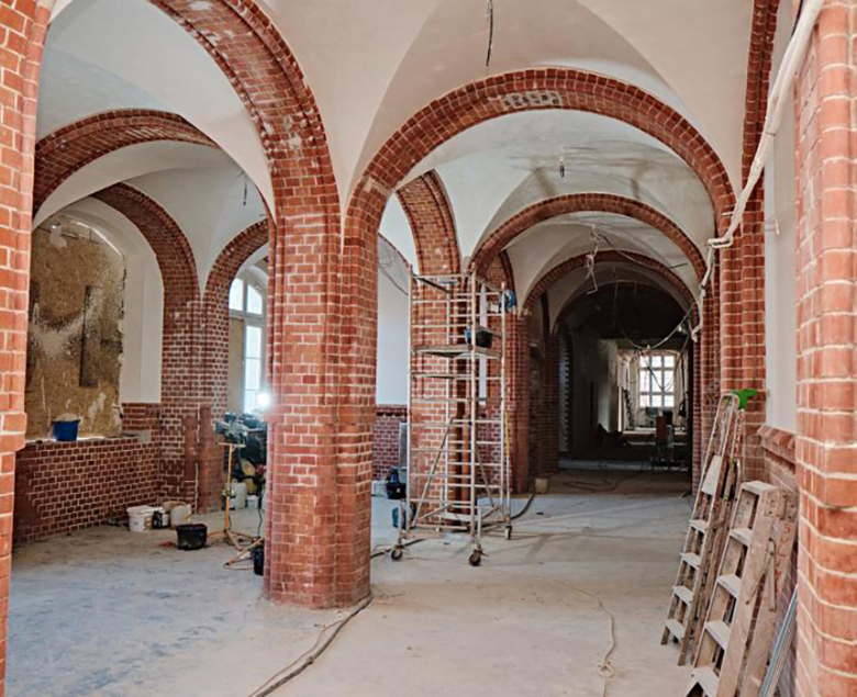 Wewnątrz głównego budynku szkolnego, w celu odtworzenia pierwotnego charakteru korytarzy oraz strefy wejściowej do szkoły, czyszczone są ponadstuletnie cegły na łukach, sklepieniach, lamperiach i pilastrach. Fachowcy mają co robić – okazało się, że miejscami elementy te były pokryte nawet siedmioma warstwami farby olejnej, co wymagało zmiany sposobu czyszczenia z mechanicznego na chemiczny, tak aby nie uszkodzić struktury historycznych cegieł.