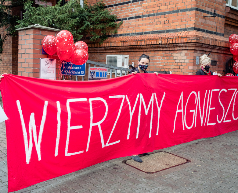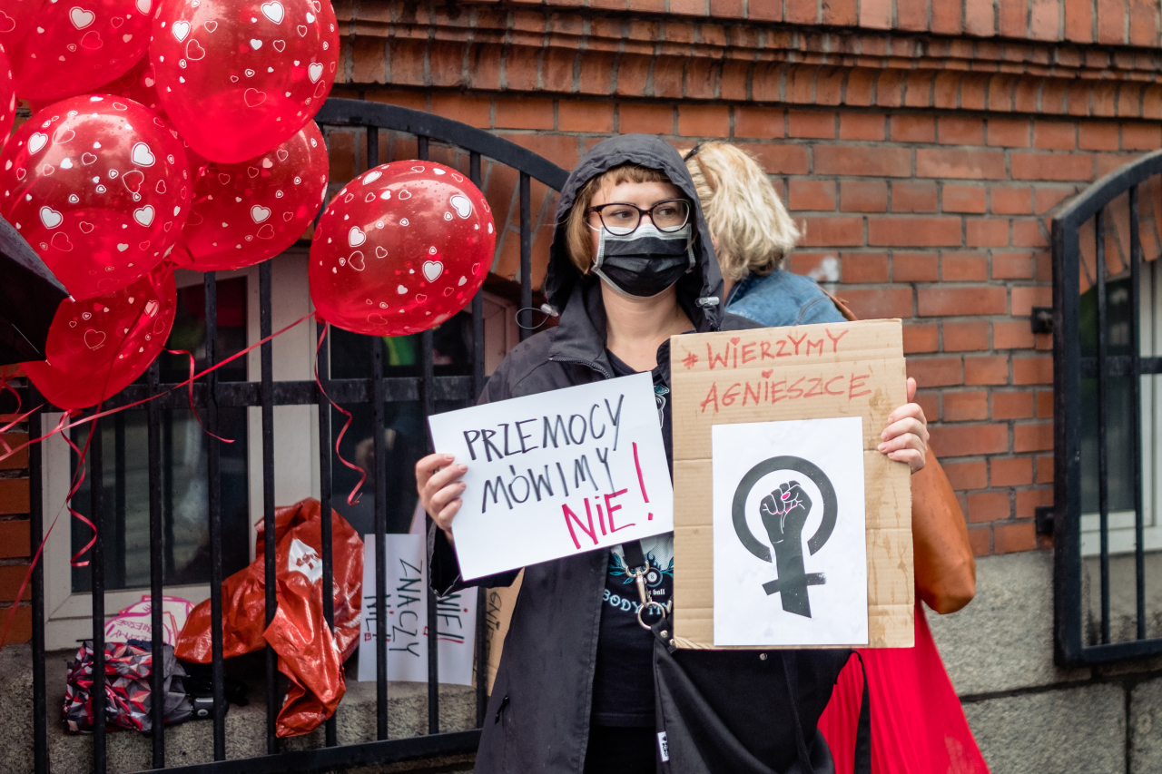 Ofiarę wspierają Fundacja Feminoteka, Antyprzemocowa Sieć Kobiet oraz „Nic o nas bez nas. Ruch kobiecy Gliwice, Pyskowice”. To te organizacje zwołały wiec tydzień i dwa tygodnie temu, a teraz, oburzone wyrokiem, zapowiadają dalszą walkę i wsparcie dla Agnieszki. Pod sądem były także uczestniczki Klubu Książki, kobiecych kręgów, młode mamy i dojrzałe kobiety, przedstawicielki Śląskiej Manify, Kongresu Kobiet Województwa Śląskiego, działaczki i aktywistki Małgorzata Tkacz-Janik oraz Katarzyna Szota-Eksner, pisarka Justyna Wydra. W pierwszy piątek dotarły mimo burzy, trzymały transparenty i czuły sprawczość oraz sensowność działania. Akcję wsparły posłanki Monika Rosa i Wanda Nowicka, senatorka Gabriela Morawska-Stanecka, a także świadomi mężczyźni.