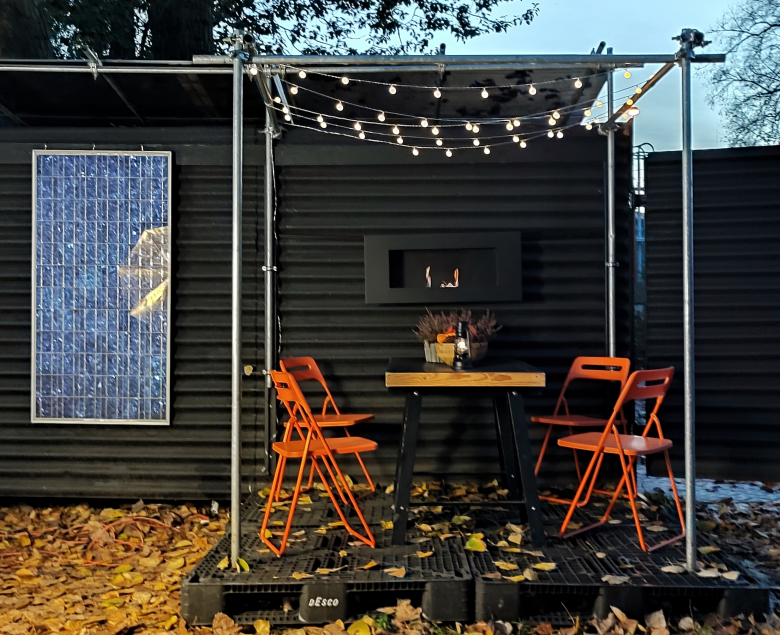 Dopełnieniem całości jest kominek na biopaliwo, który może zostać zawieszony zarówno wewnątrz jak i na zewnątrz domku, gdzie może stać się częścią przytulnego patio, zwiększającego przestrzeń życiową użytkowników. Dla zapewnienia bezpieczeństwa, domek zamykany jest drzwiami antywłamaniowymi, dzięki czemu możliwe jest pozostawienie go w lesie lub na innym terenie oddalonym od zabudowań, bez obaw o pozostawione w nim rzeczy.