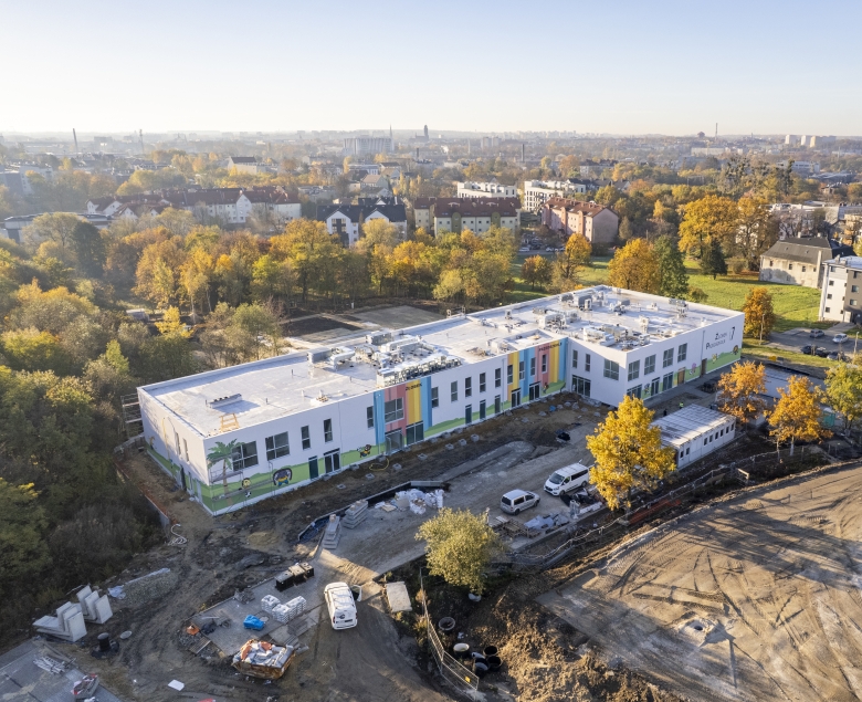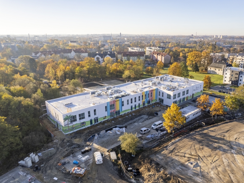 Ekologiczny charakter obiektu uzupełniają nowoczesne instalacje. Całość będzie ogrzewana podłogowo, z zasilaniem z gruntowych pomp ciepła, co pozwoli znacząco zmniejszyć zapotrzebowanie na energię. Dach zajmie instalacja fotowoltaiczna, która dostarczy część prądu niezbędnego do funkcjonowania placówki. W efekcie roczne koszty utrzymania mają być wyraźnie niższe niż w tradycyjnych budynkach o podobnej powierzchni. Kolorowa elewacja, zdobiona ilustracjami absolwentów Akademii Sztuk Pięknych we Wrocławiu, podkreśla lekki i naturalny charakter obiektu.