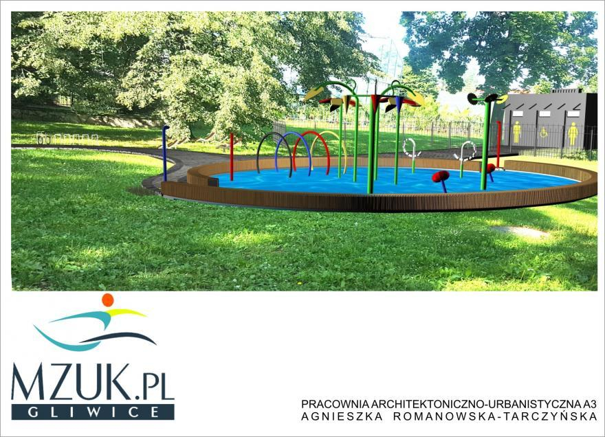 Plac, popularnie zwany „pluskadełkiem”, jest w naszym mieście nowością. Plac zabaw wyposażony będzie w tunel z kręgów, dwa urządzenia typu pączek, kwiat stokrotka, dwie palmy, liść, drzewko, wiaderka, parasol, armatkę, dysze i kolorowe prysznice.