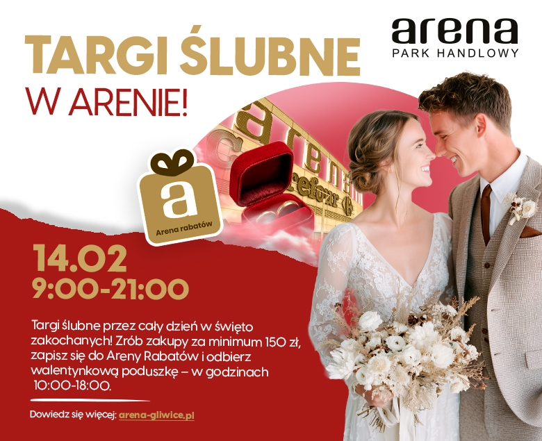 Zapraszamy na Walentynki do Parku Handlowego Arena. W sobotę, 14 lutego, w godz. 9-21 odbędą się Targi Ślubne. Wszyscy planujący zawarcie związku małżeńskiego i wesele będą mogli podpatrzeć, jakie są najnowsze trendy, na co warto postawić, a z czego zrezygnować. Wystawcy pomogą odpowiedzieć na wiele pytań, a na pewno przyszli nowożeńcy mają ich mnóstwo! Czy zdecydować się na duży bukiet, a może niewielki? Jakie są modne dodatki i jakie atrakcje uwielbiają goście – to tylko kilka przykładowych z całej listy… Warto więc wybrać się do nas. Być może coś Was zainspiruje. Będzie też okazja do wygrania walentynkowego upominku. Prowadzący wydarzenie konferansjer zaprosi do konkursów z nagrodami!