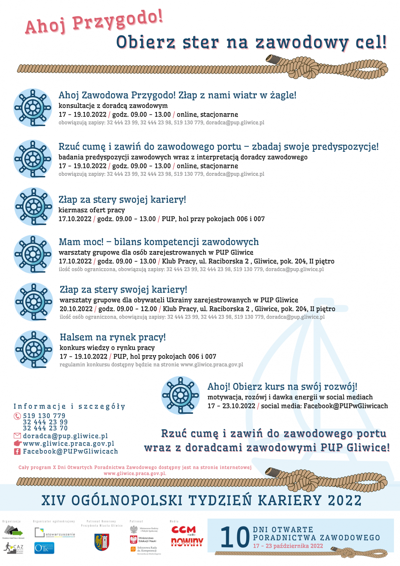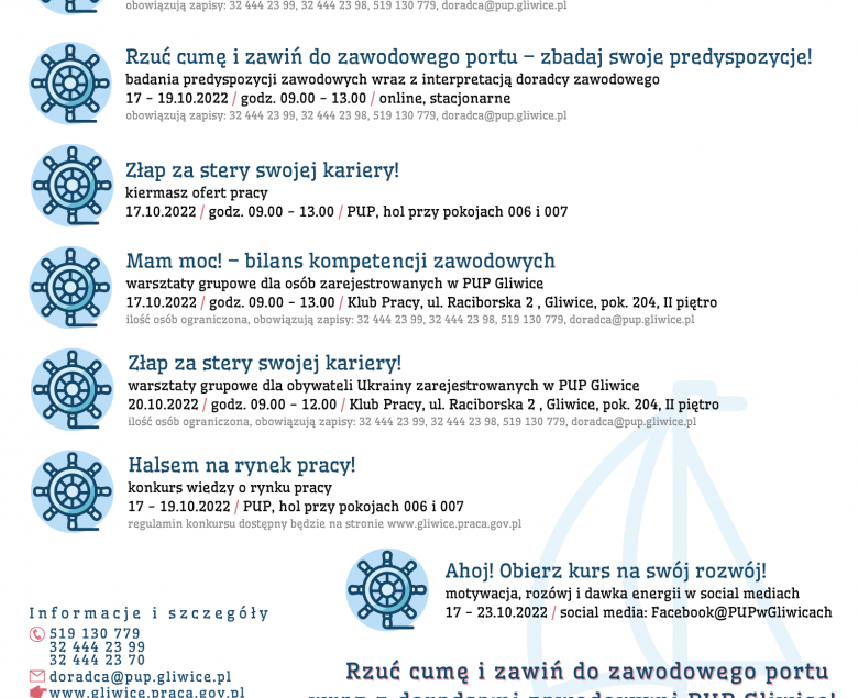 Tegoroczna jubileuszowa X edycja Dni Otwartych Poradnictwa Zawodowego skupia w sobie m.in.: indywidualne spotkania doradców zawodowych z każdą osobą zainteresowaną „Ahoj Zawodowa Przygodo! Złap z nami wiatr w żagle!” z możliwością badania ich preferencji i predyspozycji zawodowych „Rzuć cumę i zawiń do zawodowego portu – zbadaj swoje predyspozycje!”. Zapraszamy również do udziału w warsztatach grupowych o tematyce rozwoju własnych kompetencji „Mam moc! – bilans kompetencji zawodowych”. Spotkanie informacyjne dla obywateli Ukrainy „Złap za stery swojej kariery!” będzie miało na celu promocję usług rynku pracy dla obywateli Ukrainy, którzy ucierpieli w skutek działań wojennych prowadzonych na terytorium Ukrainy (uchodźcy wojenni).