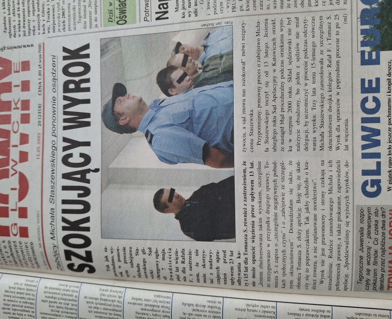 Pierwszy proces w sprawie zabójstwa Michała Staszewskiego odbył się wiosną 2001 roku w Sądzie Okręgowym w Gliwicach. Trzech sprawców stanęło przed wymiarem sprawiedliwości i miało odpowiedzieć za swoje czyny. Rodzice Michała - Pani Bożena i Pan Adam Staszewscy zdecydowali się wystąpić w procesie w roli oskarżycieli posiłkowych. Jak mówiła Pani Bożena, czuła, że jest to winna swojemu synowi, któremu poświęciła 15 lat życia i pragnie poznać całą prawdę o losie swojego dziecka. W trakcie procesu dwaj główni sprawcy - Rafał F. i Tomasz S. składali sprzeczne zeznania i obarczali się nawzajem winą.