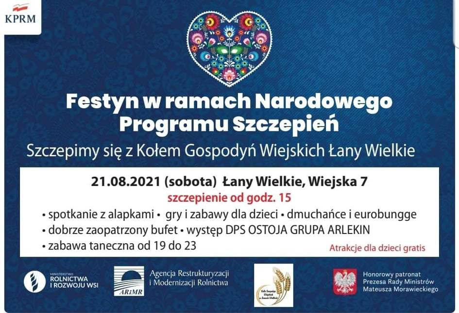 To szansa dla zapracowanych i tych, którzy nie mają czasu. Po akcjach w kilku parafiach kościelnych, w których salki parafialne przekształciły się w mobilne punkty szczepień w powiecie gliwickim (w ubiegłą niedzielę 15 sierpnia m.in. w parafii Trójcy Świętej w Rachowicach, czy w parafii św. Marcina w Stanicy) przyszedł czas na festyny w ramach Narodowego Programu Szczepień. To Koła Gospodyń Wiejskich włączają się do akcji promowania szczepień przeciwko COVID-19 w całym kraju i dzięki organizacji lokalnego festynu mogą otrzymać 8 000 złotych pod warunkiem, że podczas imprezy będzie możliwość zaszczepienia się.